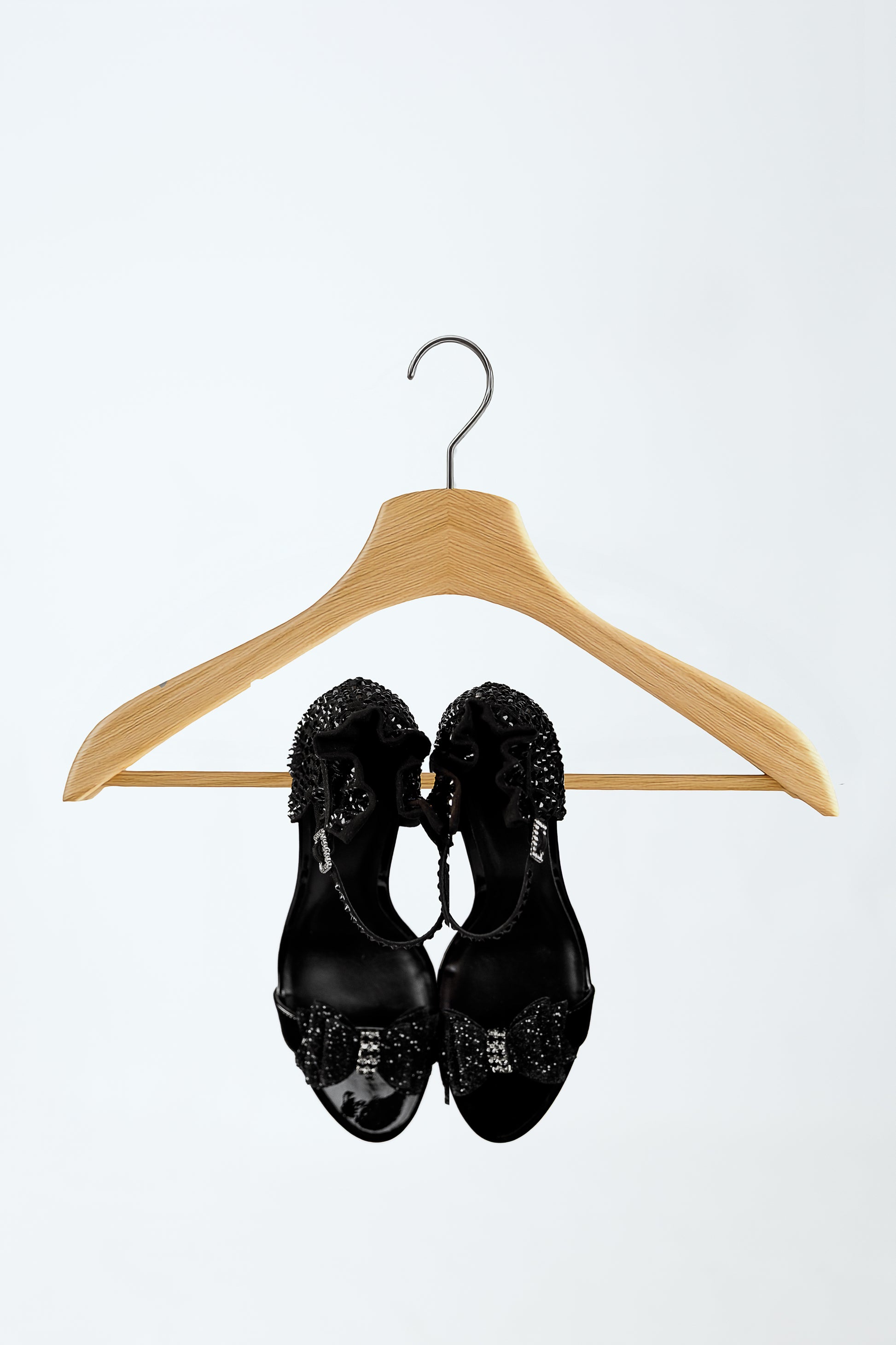 A statement piece handcrafted for bold elegance. These heels feature a black velvet base, adorned with hand-applied crystals from ankle to heel for a radiant shimmer with every step. The ruffled collar detail and rhinestone-encrusted buckle add a romantic flair, while the sculpted heel creates a striking silhouette. Finished with a bow and sparkling gem on the toe strap, these heels are designed to turn heads at galas, weddings, or upscale soirées.